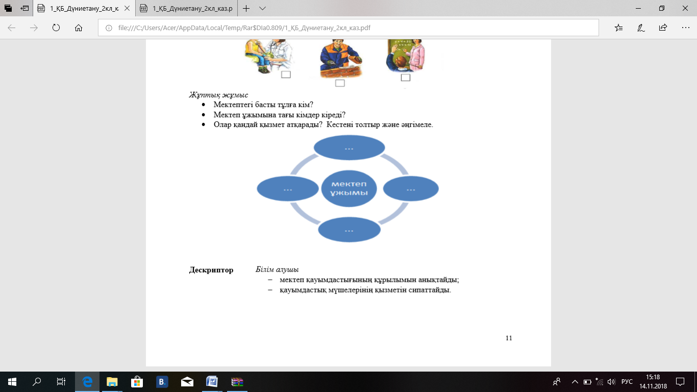 Дескриптор: -Мектеп қауымдастығының құрылымын анықтайды? -Олар қандай қызмет атқарады? -Олар немен айналысатынын жазу.