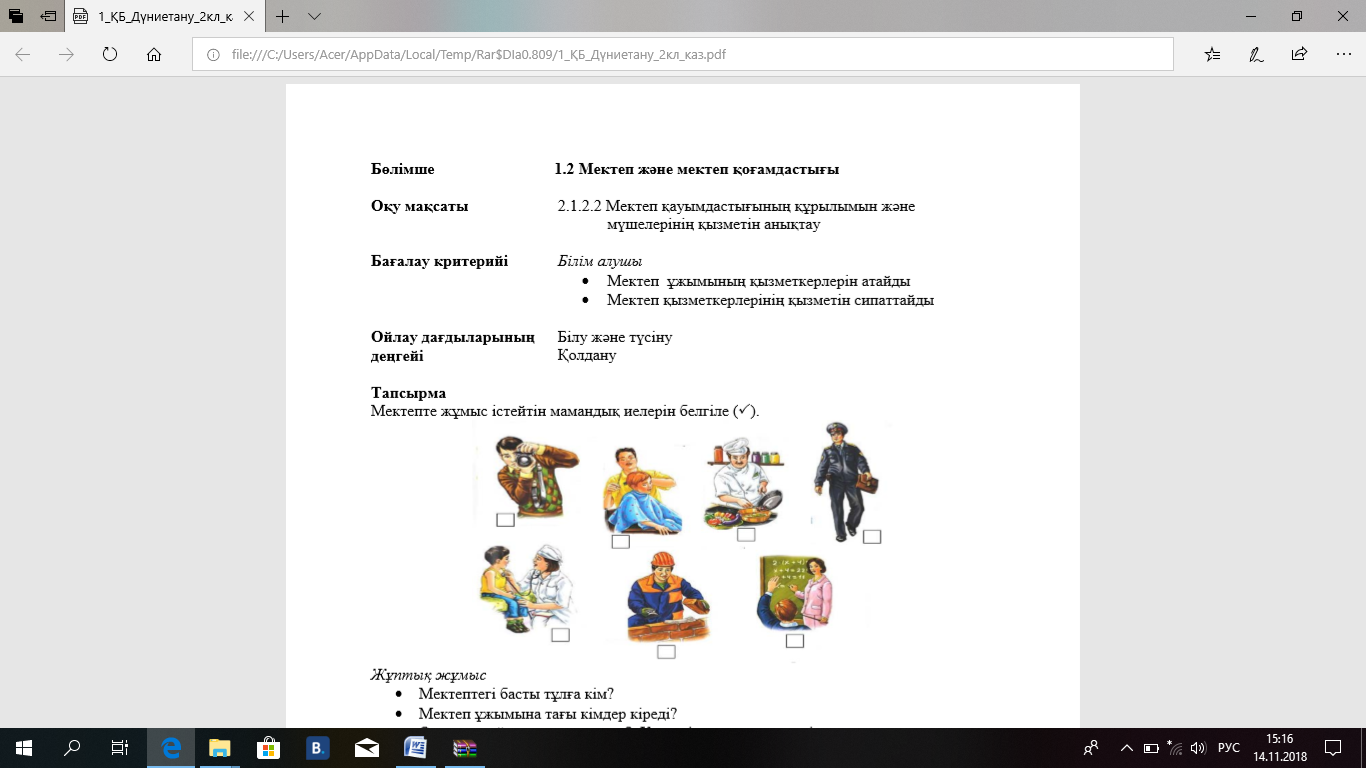 2.2.2.1 - мұғалім көмегімен қарапайым және нақтылау сұрақтарын қою және оның жауабын шығармадан таба білу 2.3.3.1 - шығармашылық жұмысын мұғалімнің көмегімен сурет, каллиграмма, аппликация, фотосуреттер арқылы ұсыну |