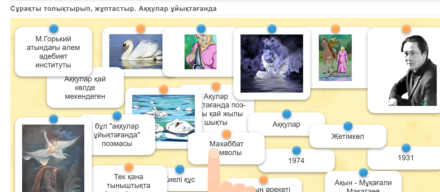 1-тапсырма. «Аққулар ұйықтағанда» поэмасы мазмұны негізінде әр топ оқушылары постер жасап, «Галлереяны» шарлау әдісі арқылы топ сикерлері қорғайды