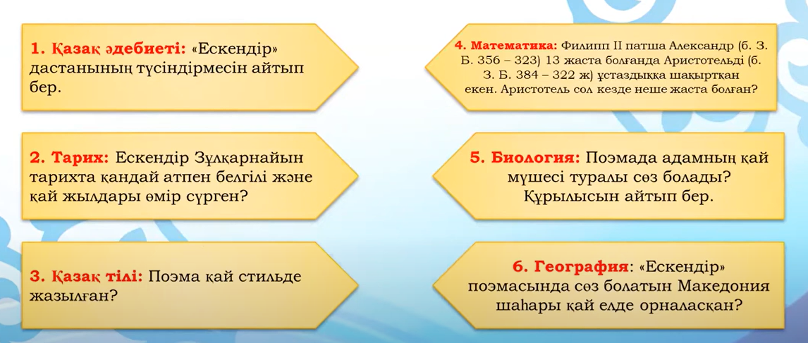 ҚБ 3-тапсырма. Жеке жұмыс. «Ой тастау, ойланту, ойлау» технологиясы. «Сұрақ-жауап» әдісі. Оқушылар тақырыпты басқа пәндермен байланыстырып сұрақтарға жауап береді.