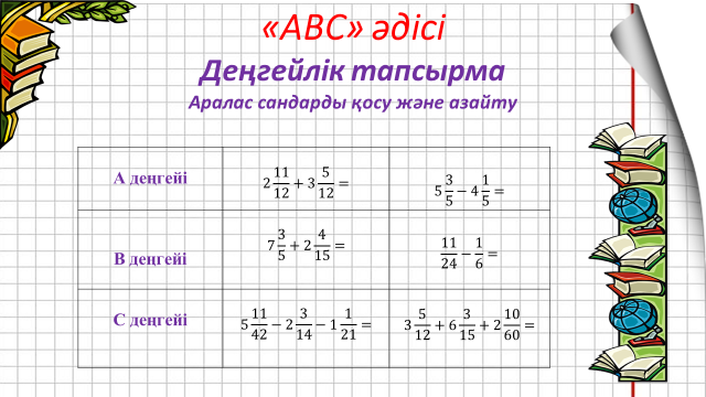 Дескриптор -Бөлімдері бірдей аралас сандарды қосады және азайтады - Бөлімдері әрүрлі аралас сандарды ортақ бөлімге келтіреді - есептің шешімін табады.