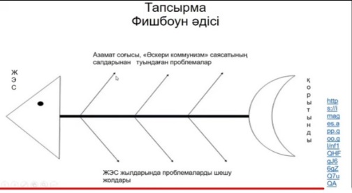 Ойлан, Жұптас, Пікірлес әдісі арқылы топтық тапсырмалар беріледі 1 топқа 1.1921-1922жылғы жер-су реформасы. 2. Жаңа экономикалық саясатқа көшудің себептері. 2топқа. ЖЭС жүргізу мақсаты және мазмұны. Жаңа экономикалық саясат кезіндегі Қазақстан. ЖЭС-тің тоқтатылуы және оның қорытындылары 3 топқа Жаңа экономикалық саясат кезіндегі Қазақстан. ЖЭС-тің тоқтатылуы және оның қорытындылары |