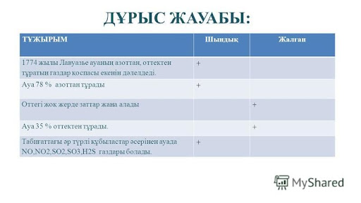 Дескриптор: Ауаның құрамын біледі Атмосфера ауасын ластанудан қорғаудың маңызын түсінеді Дескриптор: -Ауаның құрамындағы газдарды біледі -Атмосфераны қорғау шараларын түсінеді -Жану реакциясын біледі Топ бір-бірін бағалайды. Дұрыс жауап 2 балл Дұрыс жауап 1 балл Дұрыс жауап 2 балл |