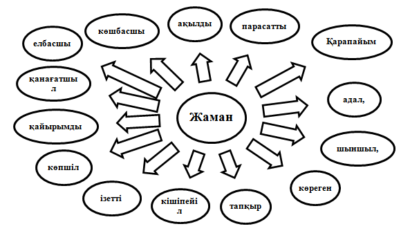 І.Ұйымдастыру кезеңі ( Оқушыларды түгелдеп ,сабаққа назарын аударамын. Сабақ мақсатымен таныстырамын) Сабағымыз сәтті өтуіне психологиялық дайындық жасау С Ә Т Т І Л І К Сүйкімді Төзімді Әдемі Тәртіпті Ізетті Құрметке лайықты Іскер Кеңпейіл Осы сөздердің ішіндегі бізге ең керекті сөз ІІ.Қызығушылықты ояту Оқушылар теңеу, портрет, синонимдер арналған мысалдар бойынша 3 топқа бөлінеді. 1.Оқушылардан үй тапсырмасын сұраймын: «Интервью» стратегиясы арқылы А) Оқушылардан ертегі желісі бойынша құрған жоспарларын сұраймын; Ә) Ертегінің мазмұнын қаншалықты түсінгенін анықтау үшін әр топқа сұрақтар қоямын: 1. Уәзірлер не үшін шөптің жаманы деп шеңгелді алды? 2. Уәзірлер не үшін Жаманды адамның жаманы деп шешті? 3. Уәзірлер неліктен құстың жаманы деп қырғауылды таңдады? 4. Жаман гауһар тастың ішінде құрт барын қайдан білді? 5. Жаман тұлпардың сиырға шатыс екенін қайдан білді? 6. Жаман ханның наубайдың баласы екенін қайдан білді? Дескриптор: