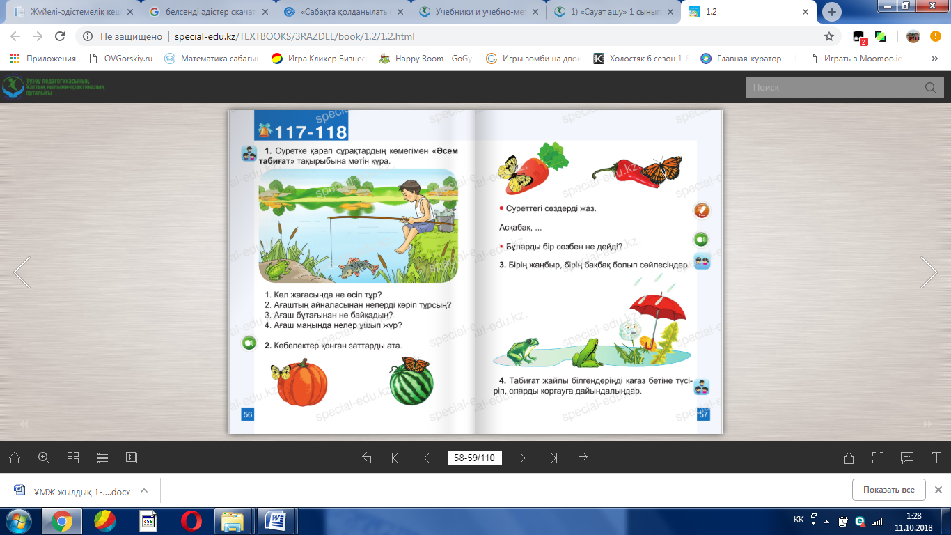 Психологиялық ахуалға берілген тақпақтарды дауыстап айтып, тілді жаттықтыру және жаңа сабаққа назар аудару. Оқушылар өздері сұрақ қойып, сұраққа жауап береді. Дескриптор: 1.Сұрақты нақты дұрыс қояды. 2. Сұраққа жауап толық беріледі. 3.3сұраққа нақты ,түгел жауап береді. |