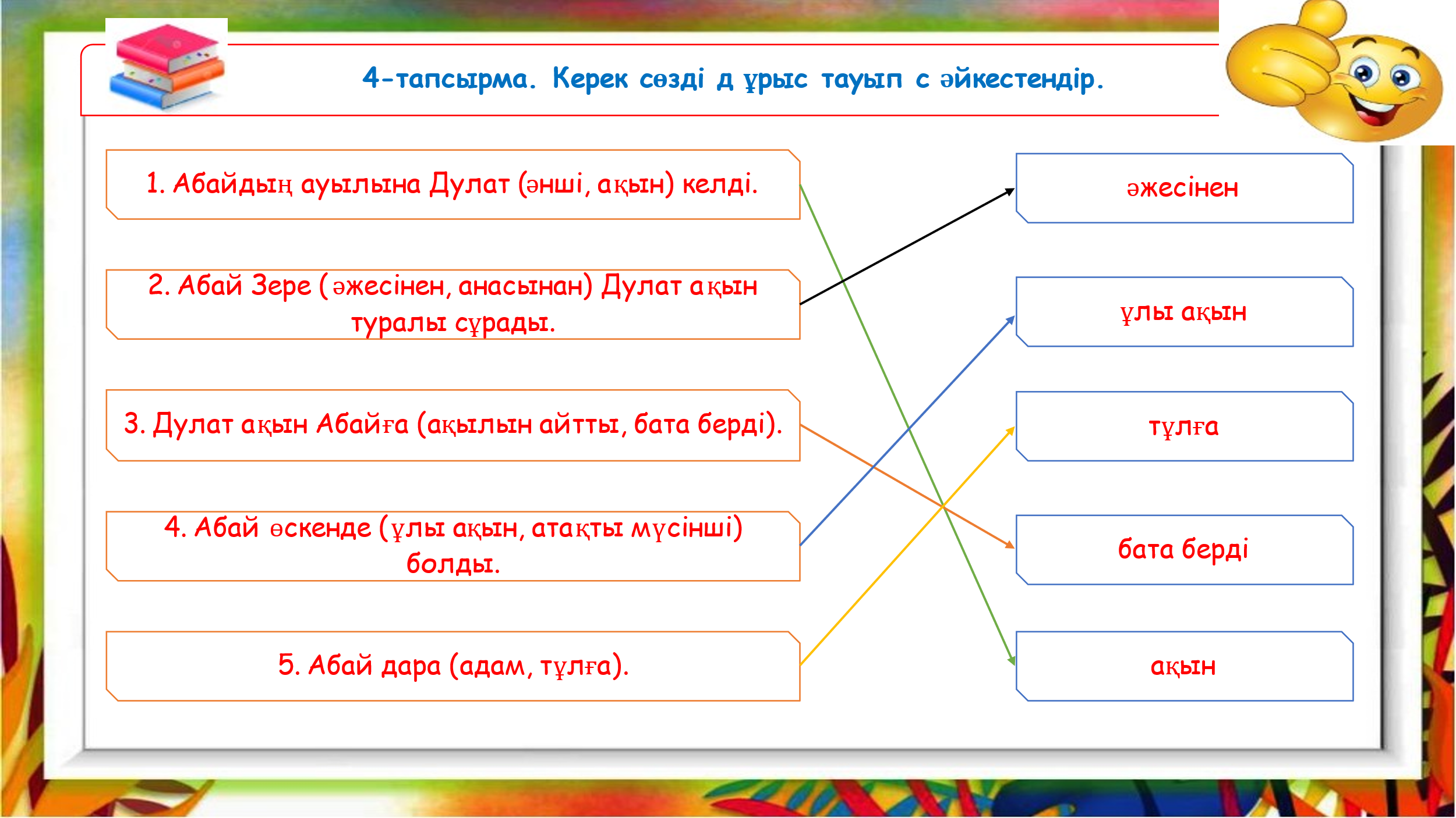 3.1.3.1.Тыңдаған мәтіннің мазмұны бойынша сұрақтарға жауап беру, сюжет желісі бойынша иллюстрацияларды орналастыру, сөздерді дұрыс сәйкестендіру, жіктік жалғауын дұрыс қолдану. |