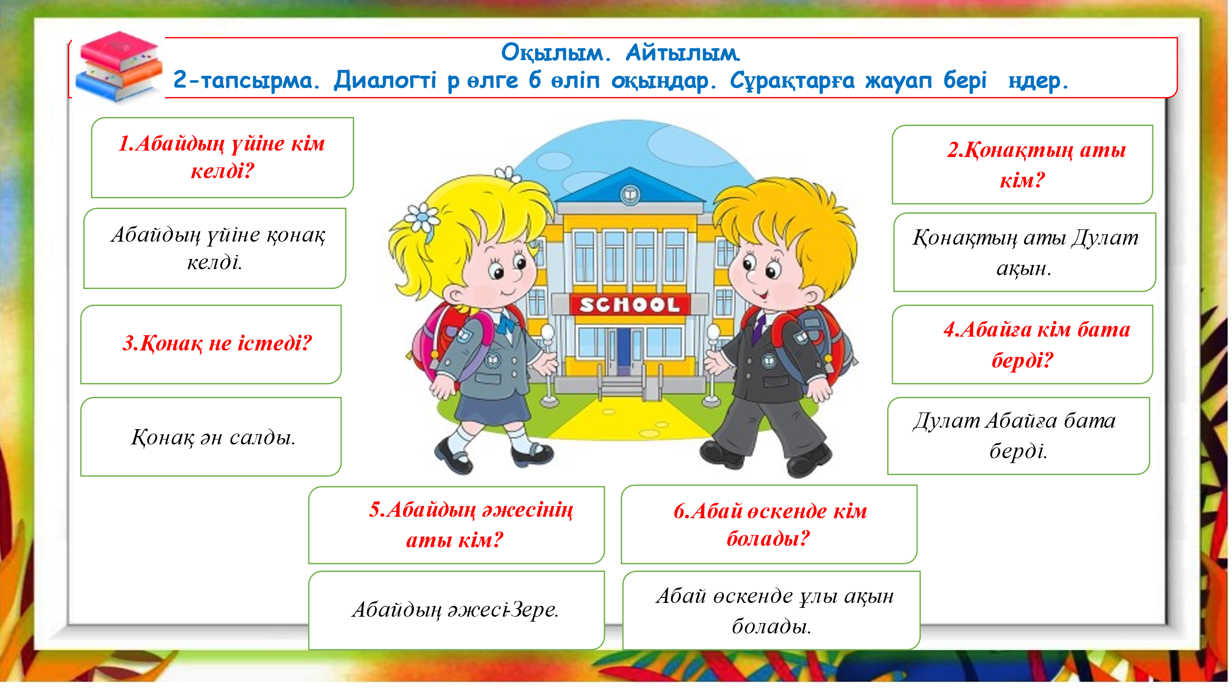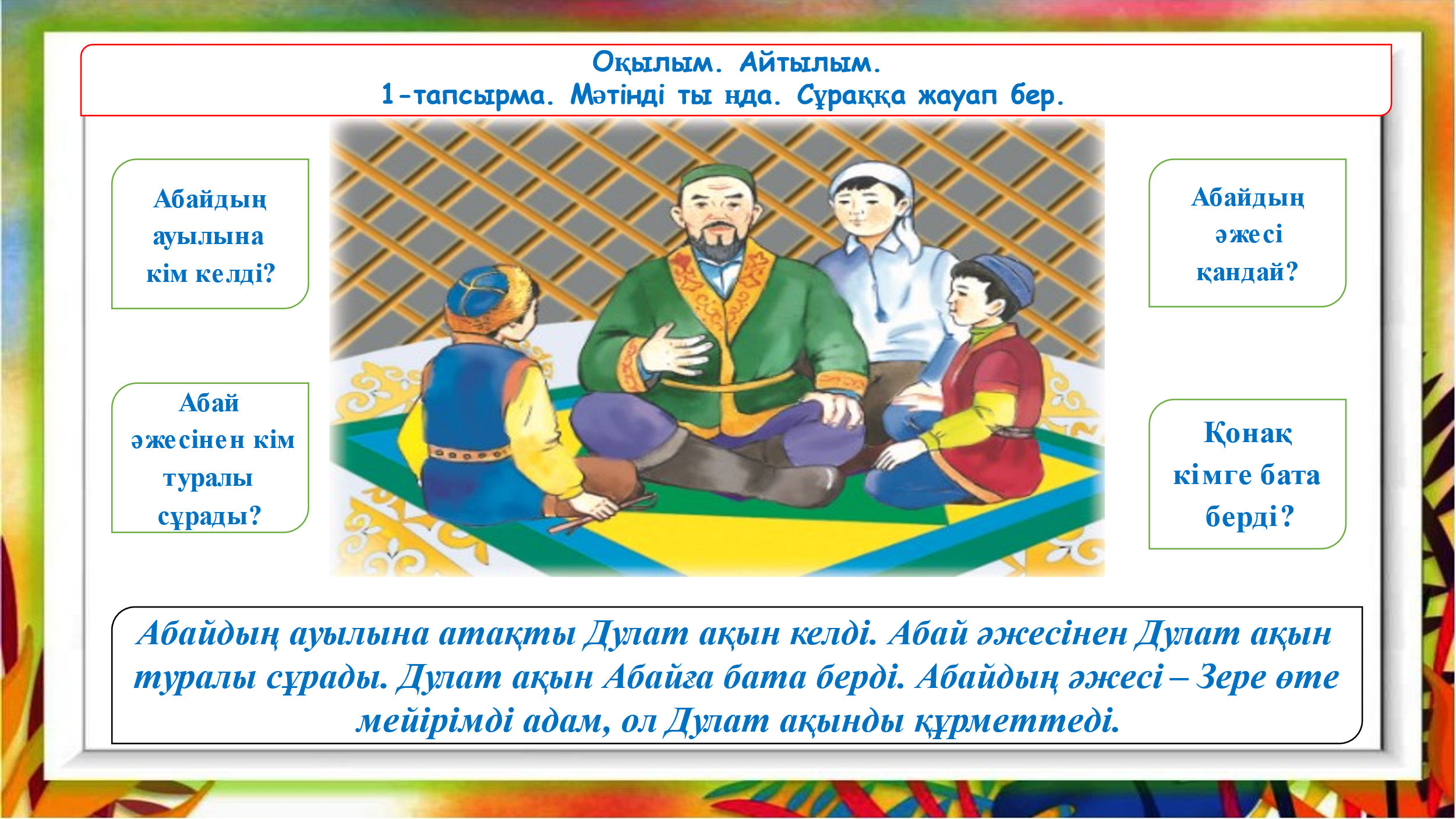 Тыңдалым. Оқушылардың тыңдау қабілетін, қазақша сөйлеуді қабылдау дағдысын дамыту мақсатында мәтін бірнеше рет тыңдалады. Тыңдалым мәтіні: Абайдың ауылына атақты Дулат ақын келді. Абай әжесінен Дулат ақын туралы сұрады. Дулат ақын Абайға бата берді. Абайдың әжесі – Зере өте мейірімді адам, ол Дулат ақынды құрметтеді.