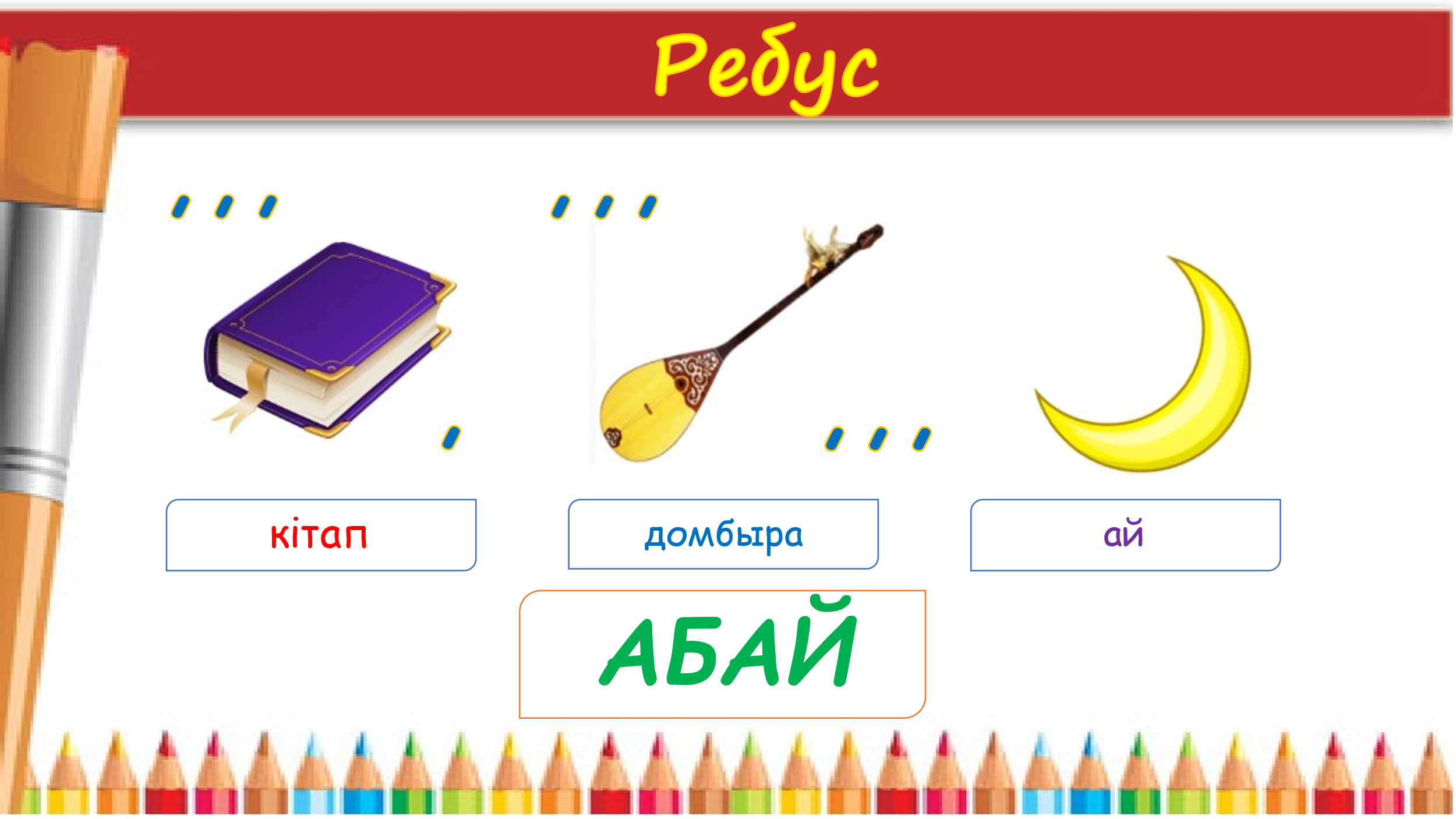 Оқушылар «кітап» сөзінен алдыңғы үш әріп пен соңғы әріпті, «домбыра» сөзінен алдыңғы және соңғы үш әріпті сызып, «ай» сөзін қосады. Сол кезде «Абай» сөзі шығады. Оқушылар ребус арқылы жаңа сабақтың атауын табады. Мұғалім: «Олай болса, бүгін біздің сабағымыздың тақырыбы «Бала Абай» – деп тұжырымдайды. Сабақтың мақсатымен таныстыру: Мәтін мазмұнын тыңдап, ақпарат алу. Мәтінді негізге ала отырып, сұрақтарға жауап беру. |