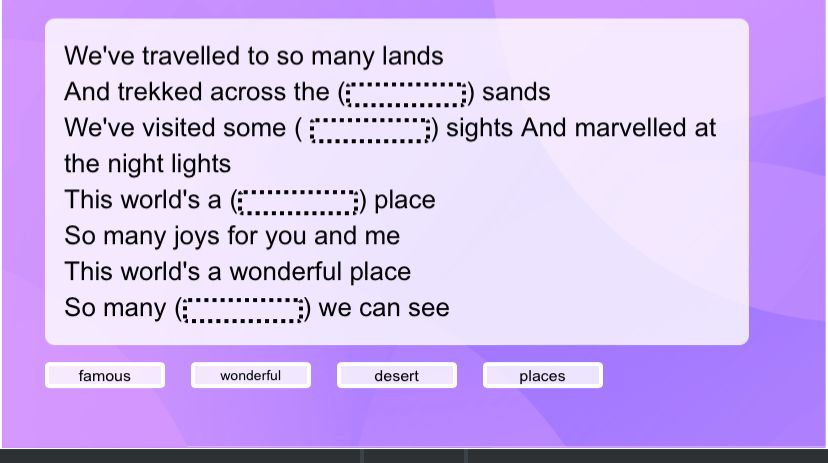 Answer We've travelled to so many lands And trekked across the desert sands We've visited some famous sights And travelled at the night lights This world's a wonderful place So many joys for you and me This world's a wonderful place So many places we can see Our world's a brilliant place to be There are so many things to see Let's take a trip just you and me And sail across the deep blue sea |