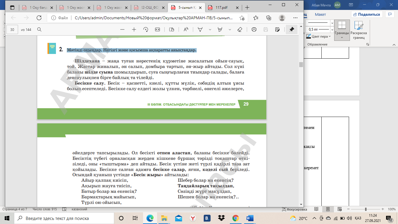 1.Оқу барысында таныс емес сөздердің астын сызыңдар. 2. Негізгі және қосымша ақпараттарды анықтап, кестеге жазыңдар.