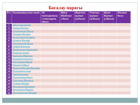 Топ басшысы әр оқушының жинаған балын шығарып мұғалімге береді.Мұғалім оқушылардың сабаққа қатысқан белсенілігін бағалау парағына қарай 1-10 баллдық жүйе бойынша әр оқушының өзіне тиісті баллын қойып бағалайды. Сонымен қатар, оқушыларды ынталандыру үшін «Қошеметтеу» әдісі арқылы бағаланады. |