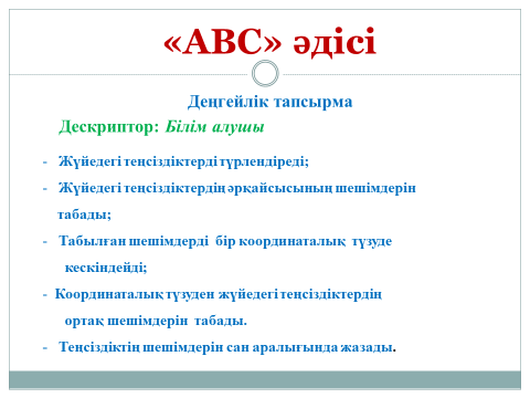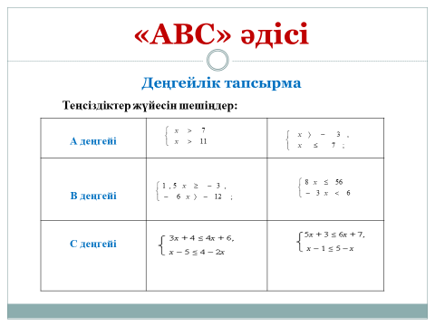 «АВС» әдісі арқылы деңгейлік тапсырмалар. А және В деңгейінің тапсырмаларын орынды отырып оқушылар орындайды. С деңгейінің тапсырмаларын тақтаға шығып оқушылар орындайтын болады. Бір уақытта барлық оқушы есеп шығарады.