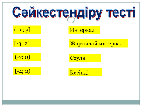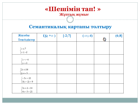 Әр дұрыс жауапқа 1 баллдан Жалпы - 5 балл Дискирптор: 1.Бір айнымалысы бар сызықтық теңсіздіктер жүйесін шешіп, семантикалық картаны толтырады. «Көршіңді тексер» әдісі арқылы көрші топты интерактивті тақтада көрсетілген дұрыс жауаптарымен тексеріп бағалайды. |