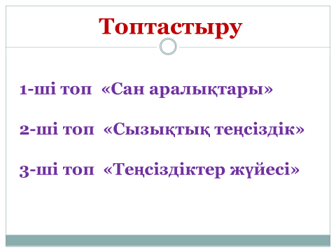 Сабақтың тақырыбы: «Бір айнымалысы бар сызықтық теңсіздіктер жүйесі. Бір айнымалысы бар сызықтық теңсіздіктер жүйесін шешу.».