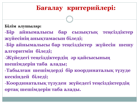 Бір айнымалысы бар сызықтық теңсіздіктер жүйесін шешуді біледі. Бір айнымалысы бар сызықтық теңсіздіктер жүйесін шешу жолдарын сипаттап бере алады. Бір айнымалысы бар сызықтық теңсіздіктер жүйесін шешу жолдарын айтып бере алады. |