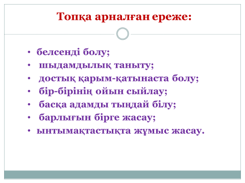 Өз ойын дұрыс мағынада білдіріп, талқылауға белсенділікпен қатысқан оқушыға «Жарайсың!» деген мадақтау сөзімен ынталандыру. Топ басшысы бағалау парағына әр сұраққа 1 баллдан бағалап отырады.