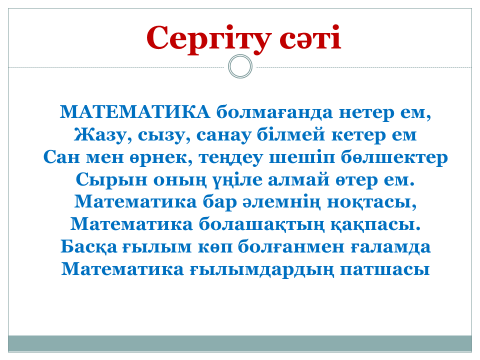 «Сергіту сәті!» Көңіл күйлерін көтеріп математикаға қатысты бір шумақ ән айтқызып сергіту. |