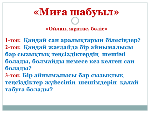 «Миға шабуыл» әдісі арқылы өткен тақырыппен жаңа сабақты байланыстыру мақсатында ой қозғау сұрақтарын ұжымдық талқылау. Оқушыларға жалпылама төмендегі сұрақтар және жаттығу түрлері беріледі. Әр оқушы өз оймен бөліседі. Өзгенің пікірін толықтырады.