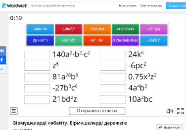 Бағалау: 5 жауап дұрыс: 1 балл; 10 жауап дұрыс: 2 балл; Дескриптор: Білім алушы - бірмүшені бірмүшеге көбейтуді орындайды; - бірмүшені дәрежеге шығарадыі; - жауапты стандартты түрде жазады. Бағалау: А- деңгей:1 балл; В-деңгей:2 балл; С- деңгей: 3 балл. |