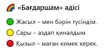 Кері байланыс (оқу мақсаты мен бағалау критерийлеріне оралу): -Бүгінгі оқу мақсаты қандай болды? - Қай тапсырманы өзіңе жеңіл деп санадың? -Қай тапсырма қиын болды? Неге? -Жұпта немесе топта жұмыс жасағанда бір-біріңе көмектестіңдер ме? -Бір-біріңді тыңдадыңдар ма? -Бүгінгі сабақ саған ұнады ма? Неліктен? -Келесі сабақта нені үйренгің келеді? Рефлекция «Бағдаршам» әдісі