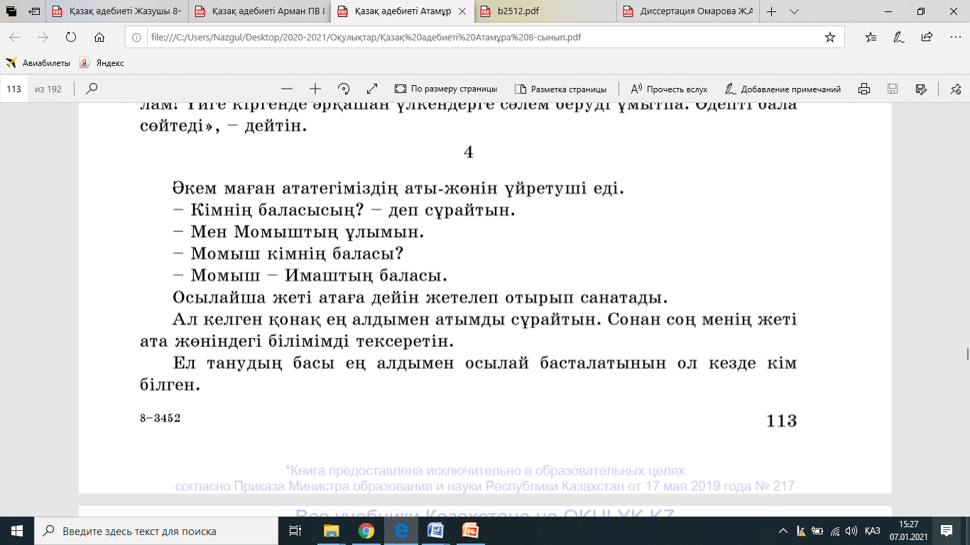 Оқушылар автор бейнесі туралы ойларымен топ ішінде бөліседі. Оқушылар автор бейнесі туралы ойларымен топ ішінде бөліседі. Бата дегеніміз менің ойымша, адамға жақсылық тілеу мақсатында беріледі. Үлкендерден бата алу жатар үшін үлкен құрмет деп есептеймін. Батаны жасы үлкен қария немесе көпті көрген ақсақалдар береді. Батаның түрлері: жол батасы, дастархан батасы, дүниеге сәби келгенде, жастар үйленгенде, т.б. жағдайларда беріледі. Бұл үзіндіде автор атадан балаға жалғасып келе жатқан қазақтың тәрбиелік дәстүрі өз ұрпағына жеті атасын үйрету дәстүрі берілген. Қазақтар негізінен жеті атаны былайша таратады: 1. Бала. 2. Әке. 3. Ата. 4. Үлкен ата. 5. Баба. 6. Түп ата. 7. Тек ата. Бала өзінен бастап әкесі, атасы, бабасы т. б. жеті атасының нақтылы есімдерін жаттап өседі. Әрбір қазақ баласы өзінен бастап жеті атасының аты-жөнін білуге міндетті. Мұны әке-шешесі, ата-әжесі үйретіп, жаттатуға тиіс. "Жеті атасын білмеген жетесіз", «Жеті атасын білген ұл, Жеті жұрттың қамын жер. Өзін ғана білген ұл, Құлағы мен жағын жер.» деген аталы сөз бар. Бұлардан тараған ұрпақтар бір атаның балалары саналады. Жеті атаға толмай бір - бірімен қыз алыспайды. Үшіншіден, бір атадан тараған туыстар бір - бірімен туыстық, бауырмалдылық, сыйластықта болады |