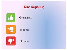 Бағалау: ҚБ«Басбармақ» тақырыпты ашу мақсатында ұсынылған «Жұптық әңгіме » әдісі бойынша ұсынылған тапсырманы орындауын өзара бағалайды . ҚБ «Екі жұлдыз , бір ұсыныс» мәтінді топпен талдап,сол мәтінге жоспар құру , ат қою деңгейлерін бақылау барысында топ бірін –бірі бағалайды. ҚБ.«Егер қаласаң, кемені боя» жазылымнан кейін өзін –өзі бағалайды. |