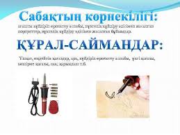 Сабақтың мақсаты: Ағашты күйдіріп өндеу технологиясын меңгерту ,ағашты күйдіріп өңдеу технологиясын жүзеге асыруда қолданылатын аспаппен таныстыру ; онымен жұмыс жасау икемділігін , көркемдік әдіс - тәсілдерді қолдана білуін қалыптастыру.