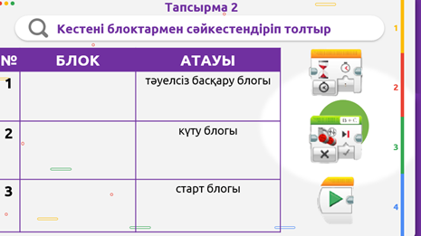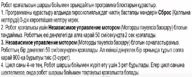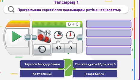 Оқушылар бейнероликті мұқият қарайды. Мұғалімді тыңдайды Тәжірбиені орындайды. 1-2 тапсырманы орындайды. Дескриптор: Рет-ретімен орналастырады. Блоктарды сәйкестендіреді. Тәжірбиені орындайды. Дескриптор: Берілген тапсырманы Lego Mindstorms Education ev3 программасында орындайды; Моторды тәуелсіз басқару блогын қолданады; Нәтижесін алады; Оқушылар ұялы телефондарында орындайды. Оқушылар тақтада орындайды Оқушы тапсырманы орындайды. Дескриптор: Берілген тапсырмаларды орындайды. Жауабын жазады; ребусты шешеді; роботтарды сәйкестендіреді; мәтінді толықтырады. |