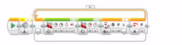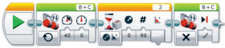 датчикті пайдалынып, робот Қосу режимін таңдаймыз. Сол жақ мотордың қуатын 40, оң жақ мотордың қуатын 0 деп өзгертеміз. Тәуелсіз басқару блогына Күту блогын жалғаймыз. Датчиктен мәліметтерді алу үшін оның режимін ауыстырамыз: Гироскопиялық датчик – Өзгерту – Бұрыш (Бағыты – 0, бұрыш – 90). Күту блогына тағы бір Тәуелсіз басқару блогын қосамыз. Өшіру режимін орнатамыз. Нәтижесінде