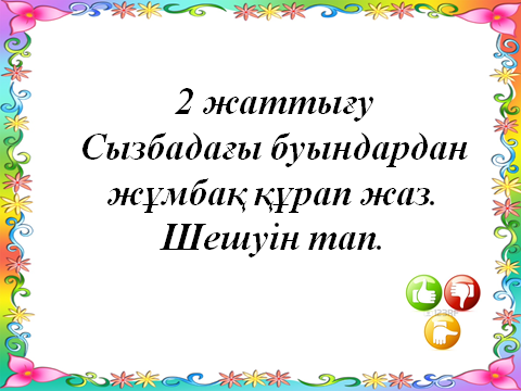 2 –жаттығу Буындардан сөз құрап оқиды.Сөздерден жұмбақ құрап жазады. Көк жүзінде көп жолақ. Шешуі:кемпірқосақ. 3-жаттығу Алатау сөзінен бірнеше сөз жасап жазады. Мысалы:Ала,тау,ау,ата\
