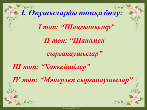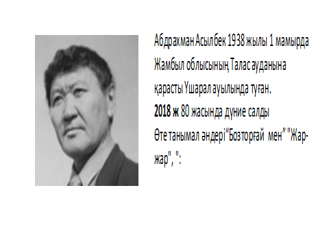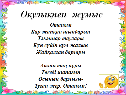 1-жаттығу Өлеңнің тақырыбы бойынша мазмұнын болжау.Өлеңді тыңдап,өлең нетуралы екенін айтады. Өлеңнің авторымен таныстыру Өлеңнің авторы Өлеңнің мазмұнына байланысты жүргізілетін жұмыстар: ;сөздік жұмысы жүргізіледі;б)жекеоқушыларға оқытады; в)мазмұнына байланысты сұрақтар қояды;г)топқа өлең шумақтарын бөліп береді; ғ)мәнерлеп оқытады. Балалар сендер тапсырманы жақсы орындадыңдар