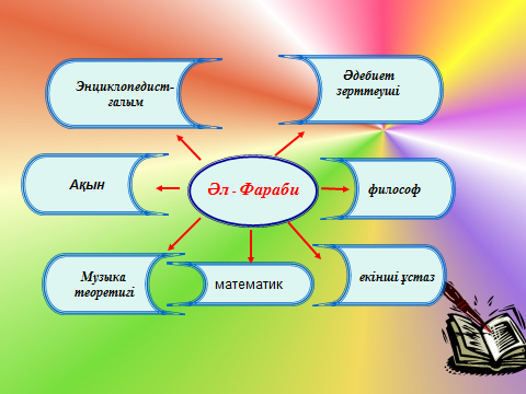 Көрнекілігі: Сызба,плакат,улестірмелі қағаз. Әл Фарабидің суреті,тест, стиерлер маркер, «Даналық ағашы» өлең жолдары азылған қима қағаздар.