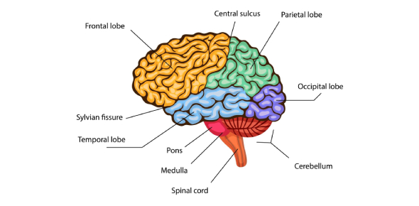 Watching video with the artificial intelligence person. Children, look at the picture and say what parts of the brain you see?