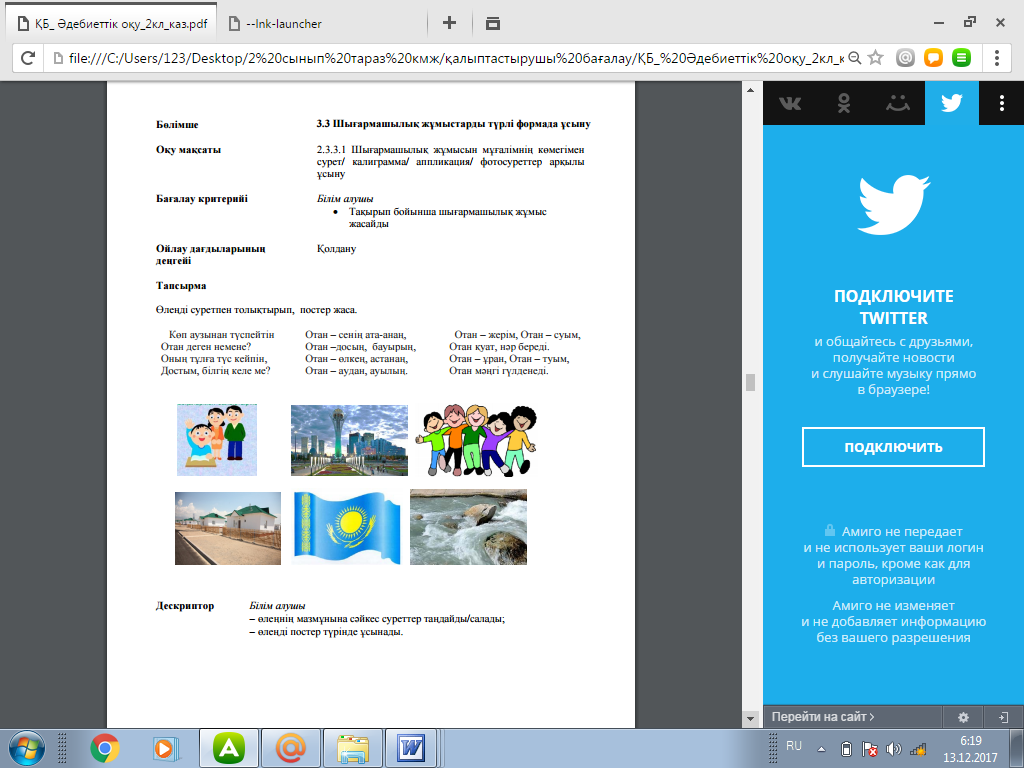 2.1.5.1 - өз ойы мен сезімін тірек сөздерді пайдалана отырып жеткізу 2.2.4.1 - мақал-мәтел өлеңнің жанрлық ерекшеліктерін анықтау 2.3.2.1- мұғалім көмегімен үлгі бойынша шағын мәтіндер жазу немесе дайын ұйқастарды қатыстырып шумақтар |