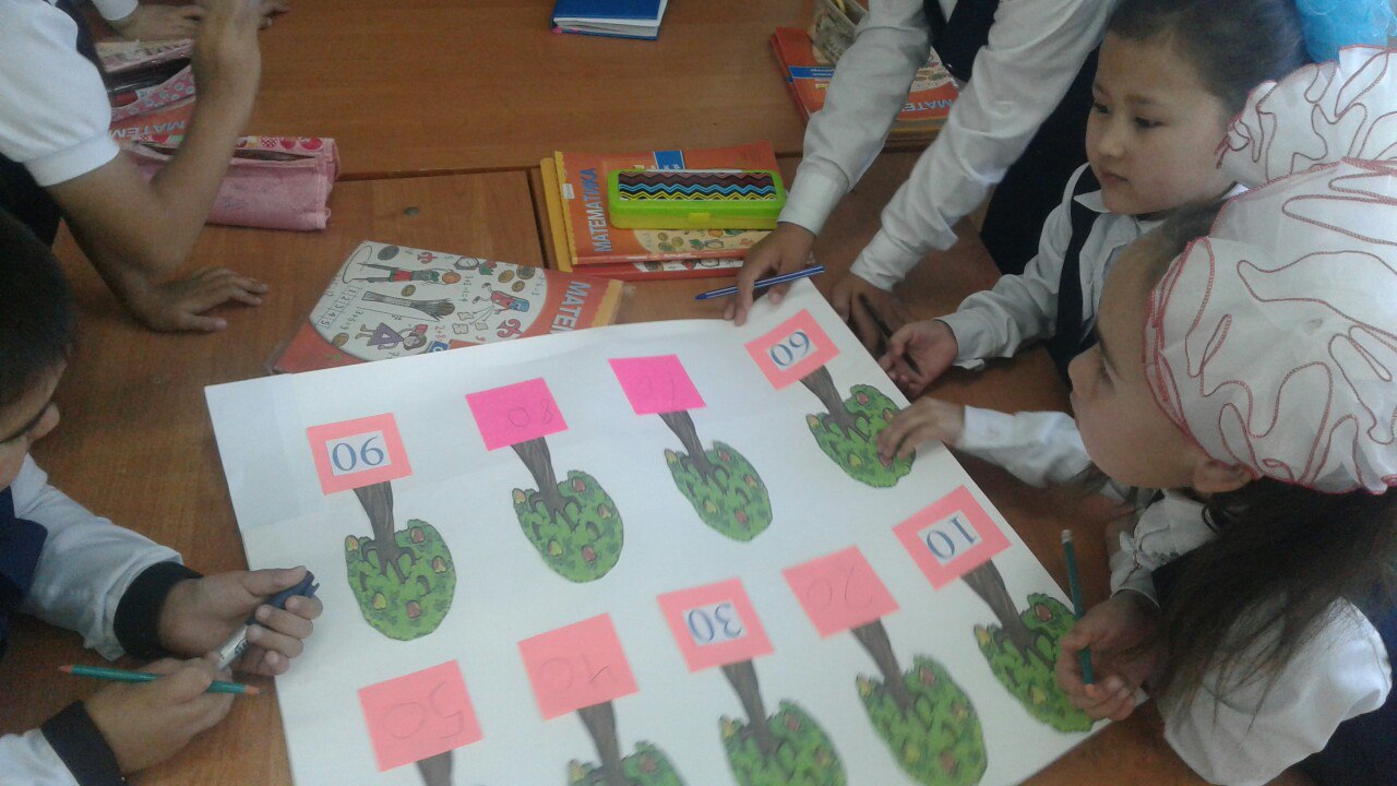 Топтық жұмыс. «Кім шапшаң?» әдісі. - Торсықта қандай сан жасырынып жатыр? - Ағаштардың тізбегіндегі белгісіз санды тап. - Сандарды салыстыр - Тиындарды сана, әмиянға сал. К.Б Сұрақ - жауап Б. Топтар бірін – бірі бағалайды. «Айналмалы бекет» Логикалық сұрақтар: -Спорт жарысына 20 ұл және 10 қыз қатысты. Жарысқа барлығы қанша бала қатысты? - Дұрыс жауабы:30