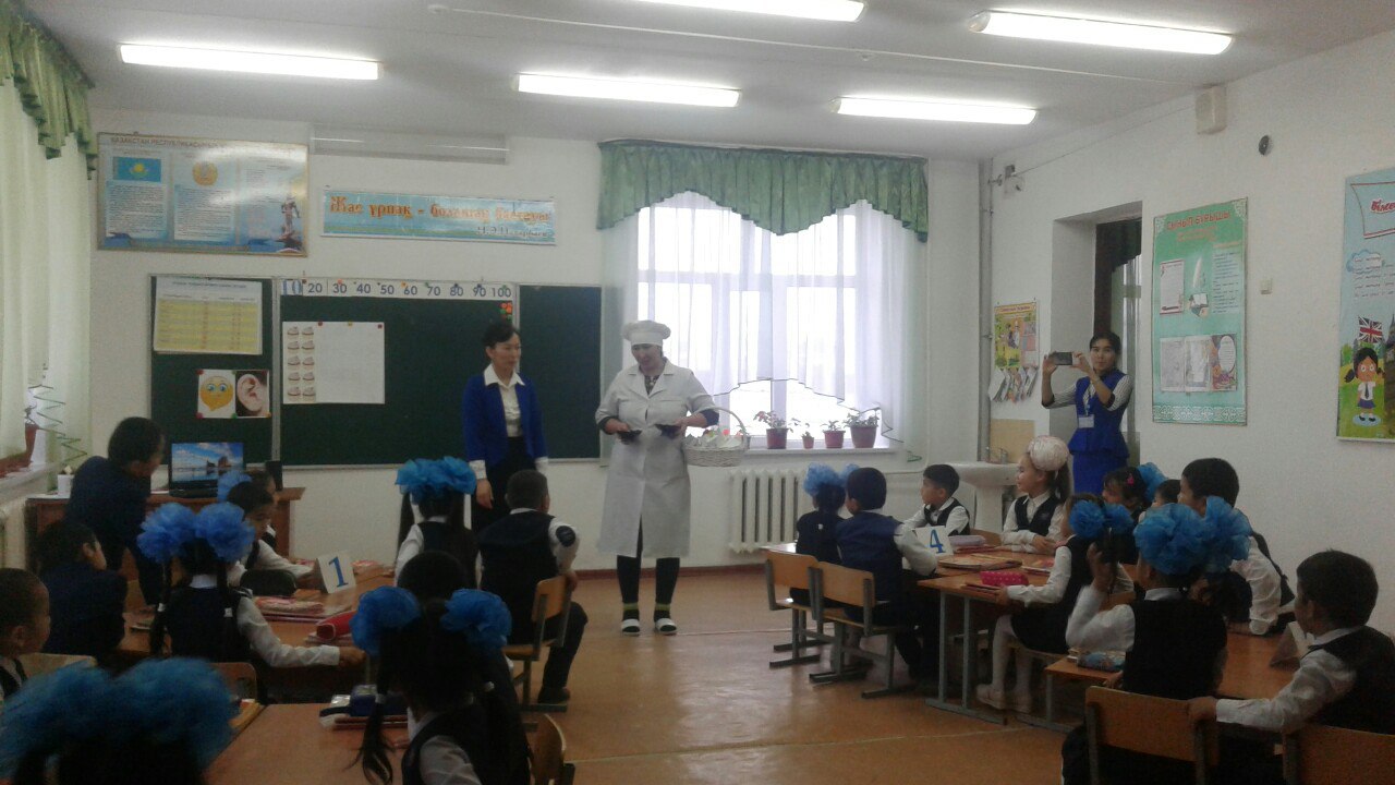 Ұйымдастыру кезеңі Ынтымақтастық атмосферасын қалыптастыру. Қимыл іс-әрекет арқылы. Қуан шаттан, қуан шаттан! Қуанатын күн бүгін. Қайырлы күн достарым, Сәттілікке толы күн болсын! Аспазшы келеді. Тосын сый: Топқа бөлу. Оқушылар пісірмелердің тәтті тілектерімен топқа бірігеді. 1 – топ Денсаулық 2 – топ Бақыт 3 – топ Сәттілік 4 – топ Байлық Ширату - Оқушылар бізде бүгінгі күн ерекше күн. Жаңа бізге базарлығын сыйлаған кім?