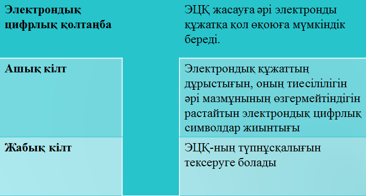 электрондық құжатқа қол қоюға мүмкіндік береді. Сертификат иесі