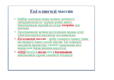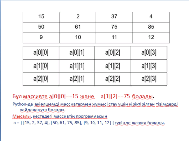-Екіөлшемді массивтерді түсініп, жазылуын үйренеді; -Python программалау тілінде есептер шығарады. |