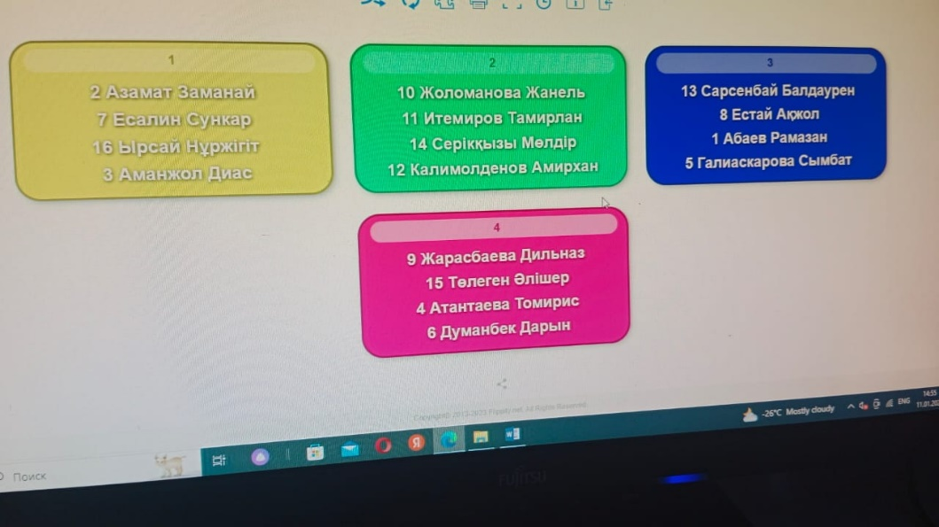 Ұйымдастыру кезеңі Оқушылармен амандасу, түгендеу, сабаққа дайындығын бақылау. Оқушыларды ең алдымен flippity әдісі арқылы топқа бөлеміз