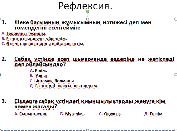 Белсенділік танытқан оқушыларды «Мадақтау сөз» әдісі арқылы бағалау Дескриптор: Білім алушы үшбұрышқа сырттай сызылған шеңбер радиусының формуласын қолданады - үшбұрышқа іштей сызылған шеңбер радиусының формуласын қолданады. Дескриптор арқылы Әр сұрақтың ұпай санын жинайды |