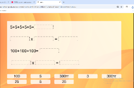 2-тапсырма. Зерттеу. ТЖ Әр жиын элементтерін атайды, әр сызба бойынша санды өрнек құрады, 3 + 3 + 3 және 4 + 4 + 4 өрнектері тең жиындардың қайсысының бірігуіне сәйкес екенін анықтайды. Сонымен қатар әр өрнектегі сан мен қосындылардың мәні нені білдіретінін анықтайды. Бірінші сурет бойынша қосу амалымен (3 + 3 + 3 = 9), соңынан көбейту амалымен (3 • 3 = 9) теңдіктер құрады. Екінші сурет бойынша қосу амалымен (4 + 4 + 4 = 12), соңынан көбейту амалымен (4 • 3 = 12) теңдіктер құрады. 3-тапсырма.ҰЖ. Lumio.com платформасы. «Бос орынды толықтыр» ойыны 3-тапсырма Бос торкөздерге тиісті сандарды қой. 5+5+5+5+5=25тг 5*5=25тг 100+100+100=300тг 100*3=300тг