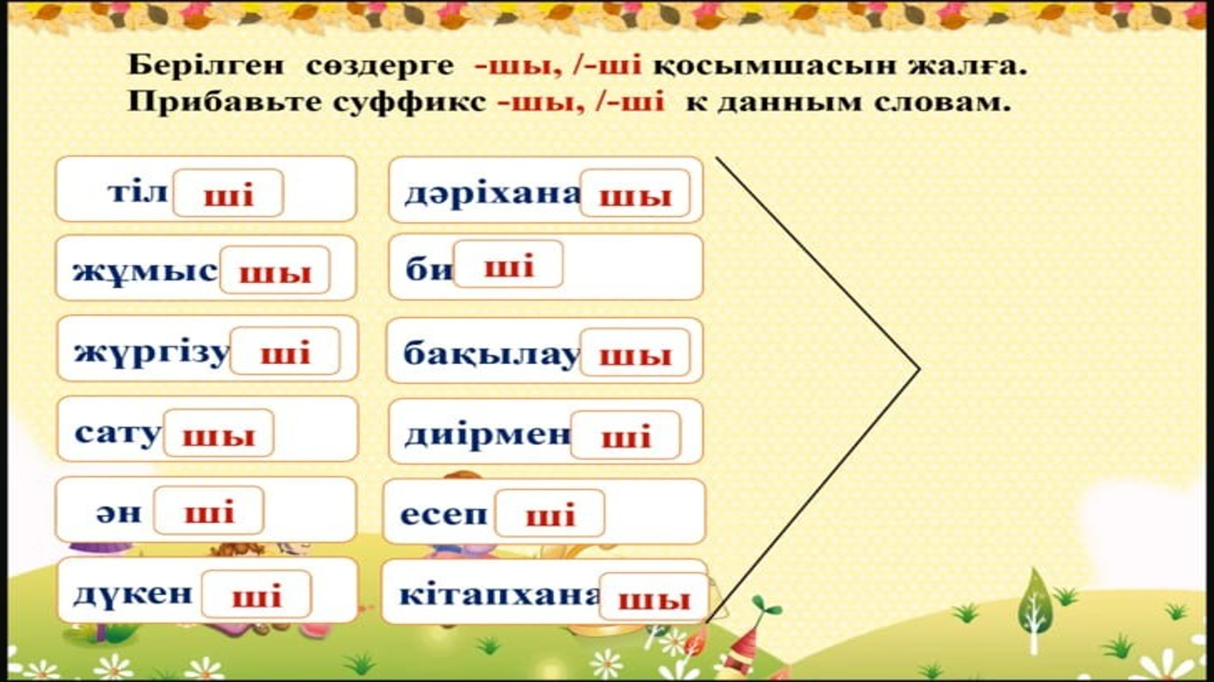Айтылым "Шеңбер бойымен" әдісі арқылы сөздермен сөйлем құрау Айтылым Қазақ тілінде –шы, -ші жұрнақтары етістіктер мен зат есімдерге жалғанып, жаңа сөз тудырады , яғни мамандық атауы. Суффикс –шы, -ші добавляется к глаголу и к существительному делает из них профессии (образует новые слова). Берілген сөздерге –шы/ - ші қосымшаларын жалға. Жүргізу- жүргізу ______ Есеп – есеп______ Дүкен – дүкен______ Диірмен – диірмен_______ Бақылау – бақылау_______ Сату- сату_______ Жұмыс-жұмыс________ Тапсырмаларды орындауда жұрнақты дұрыс жалғайды