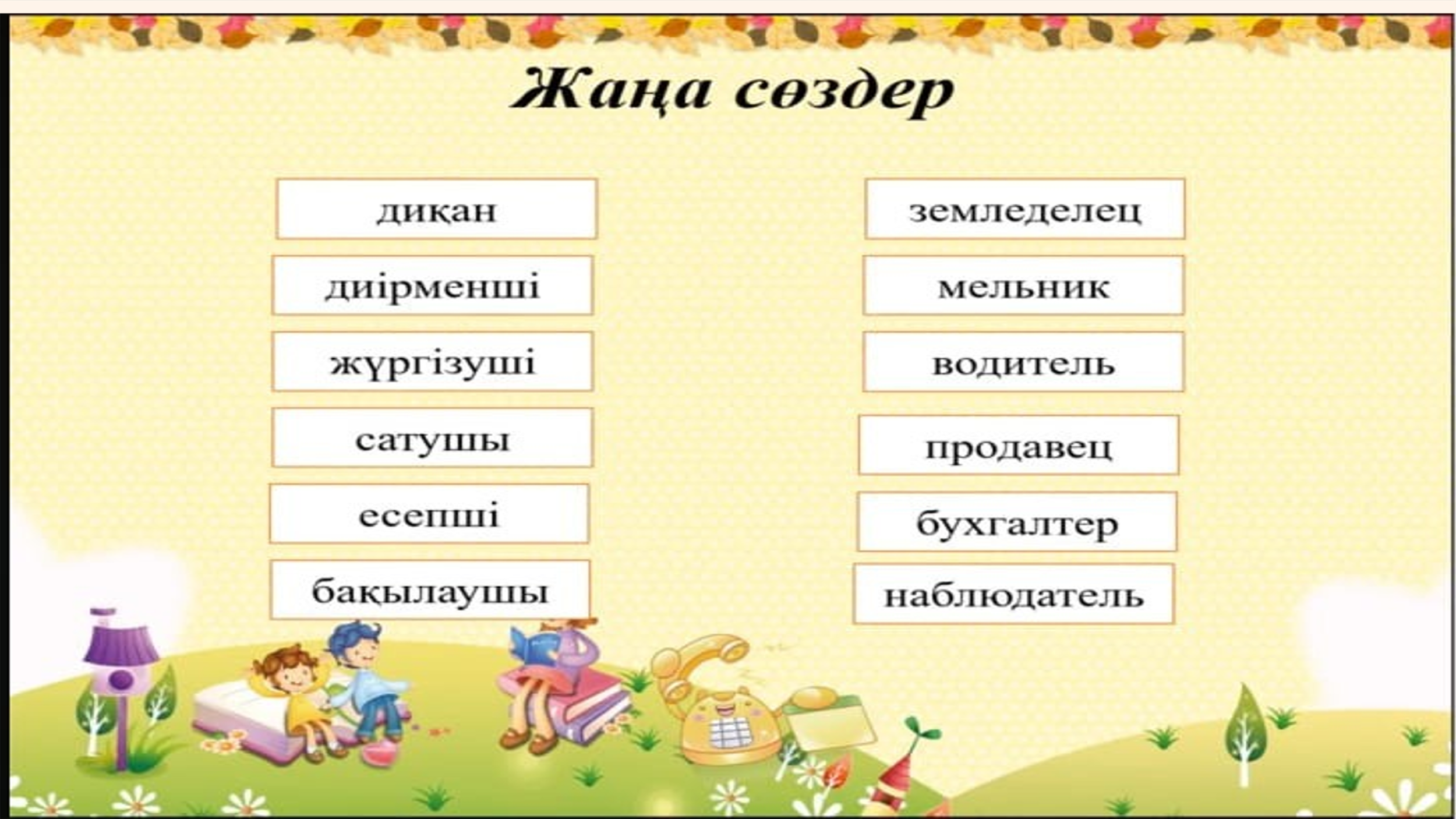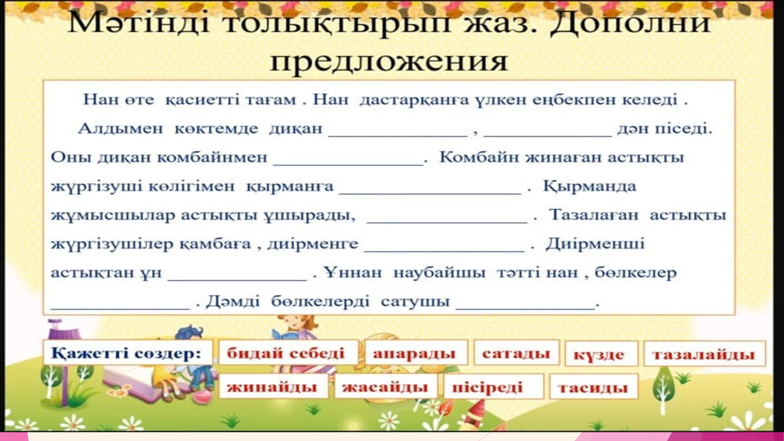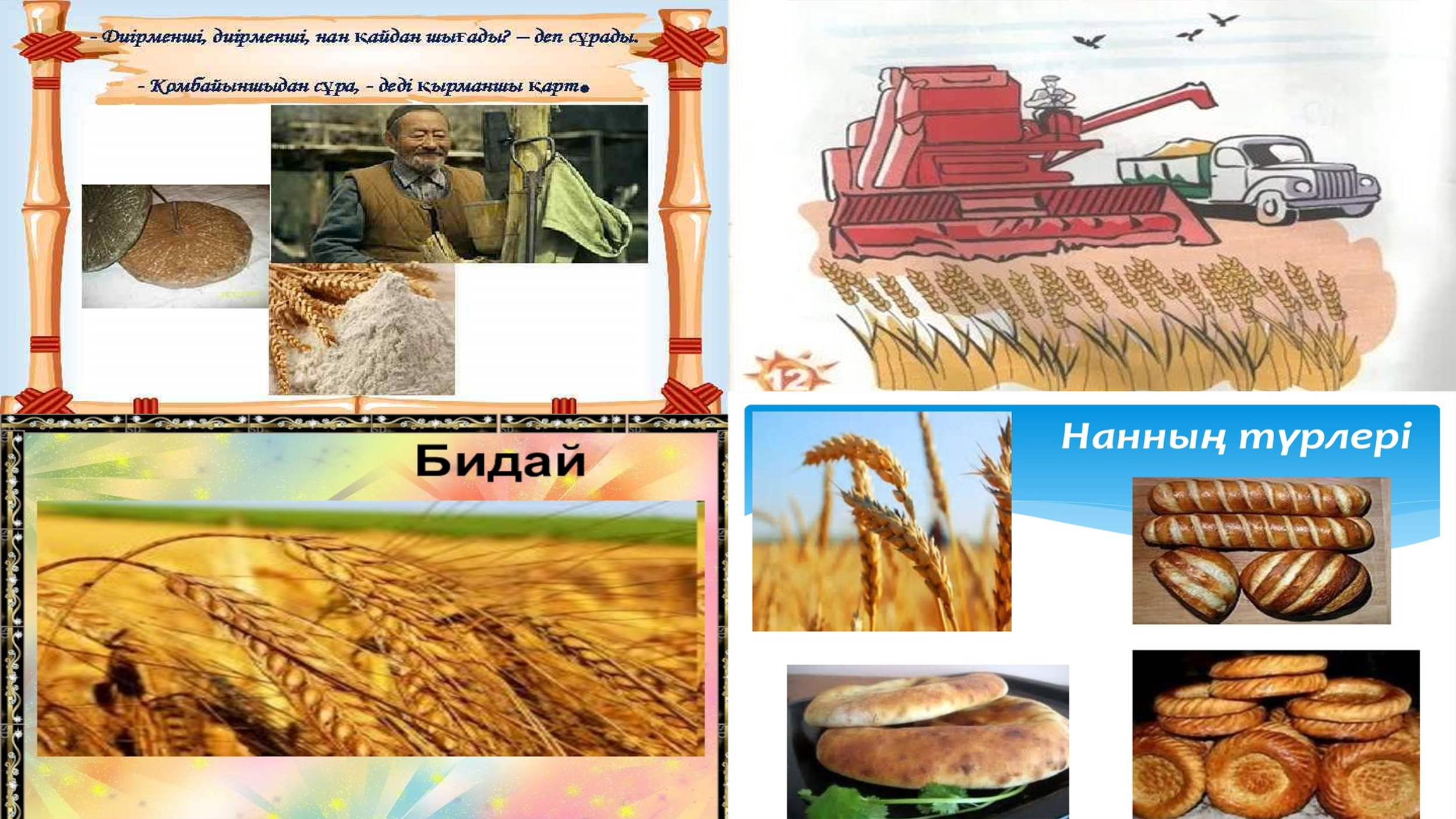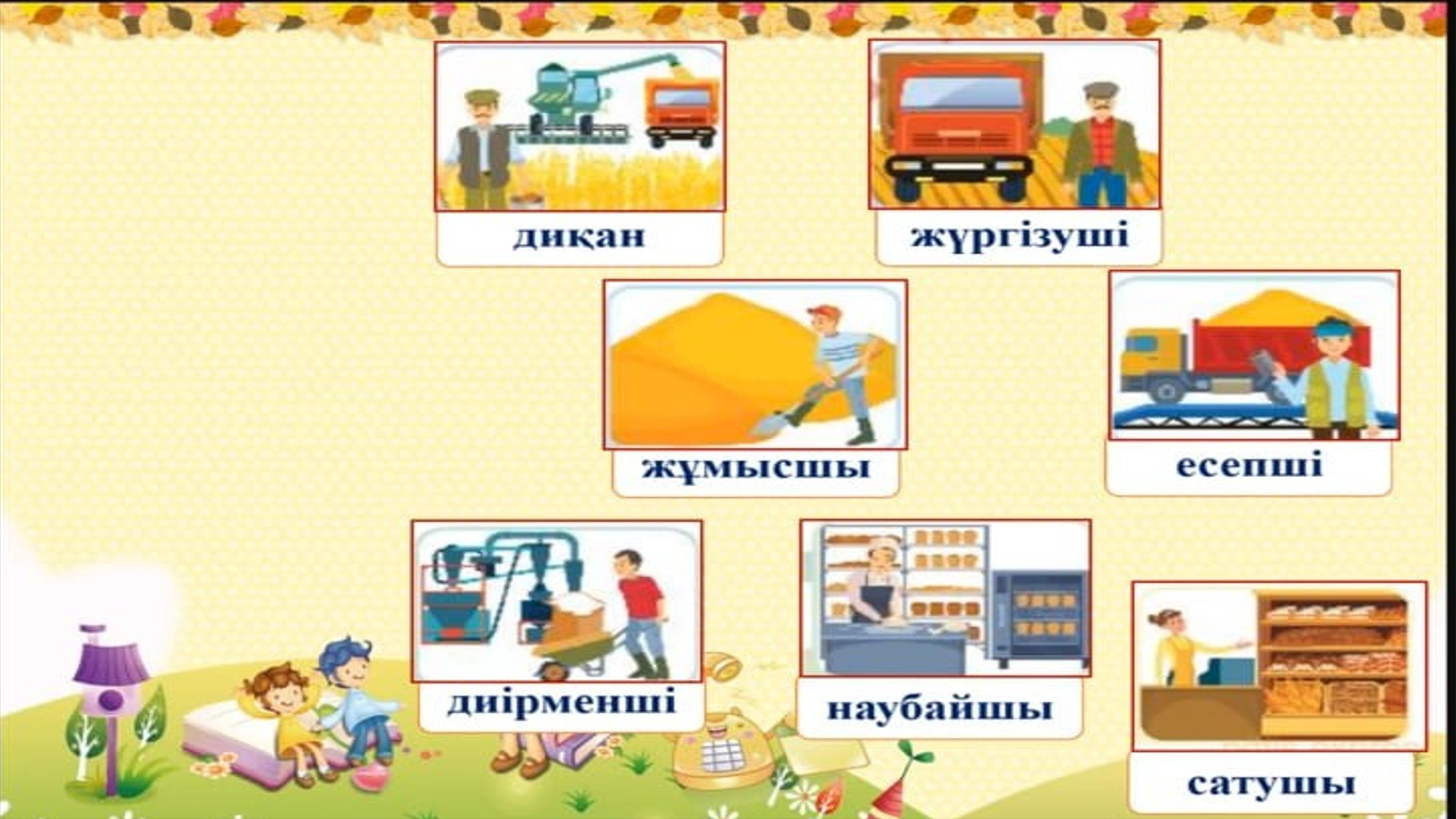 Оқылым Айтылым Мен диқан боламын, Егін егіп, орамын. Жүргізуші боламын, Қамбаға астық құямын. Мен жұмысшы боламын, Қырманды таза қыламын. Мен есепші боламын, Өлшеп астық аламын. Диірменші боламын, Астықтан ұн аламын. Мен – наубайшы, шырағым, Нан пісіріп тұрамын. Мен сатушы боламын, Тәтті тоқаш сатамын.Жазалым Тақырып бойынша 4 сөйлемдерді құрап 2 топ болып орындайды