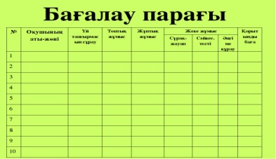 Бағалау парағымен танысады Топ басшысы үй тапсырмаларын тексере келе, әр топтан 1-2 оқушы оқиды
