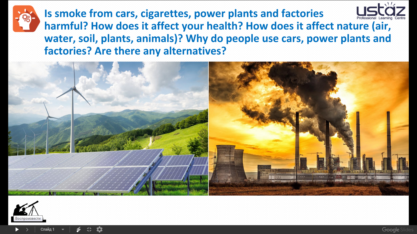 2.1 Terminology «Find the words» Ойын «Кahoot!» Game «Kahoot!» https://play.kahoot.it/v2/lobby?quizId=4048c46c-e603-472e-a3f9-3b9fbd2ece78 Visit the site Кahoot play. Find and click on the number. Did you clicked? Then start game. Albert good . You took first place. We difine the speaker. Look at the speaker behind the chair. Who is a speaker? Albert is a speaker. 2.2. Thoughts excited. Illustrations showing polluted atmosphere. What are you thinking? A picture of a polluted atmosphere What does your motivation lead to? 2.3 The method of «Freeze – frame» Let's watch the video for a deep understanding of the meaning of the topic http://ustaz.uplc.kz/physics8/8205-2/