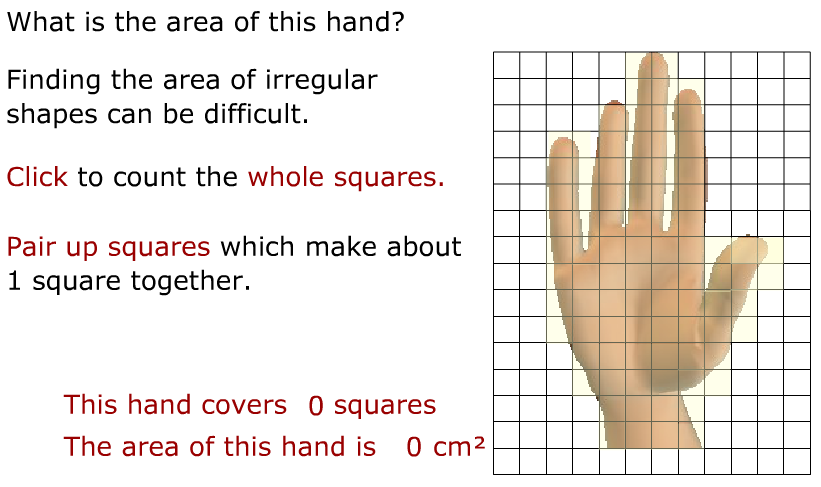 Тапсырма 2 Суреттегі алақанның ауданы неге тең? Дұрыс емес фигураның ауданын табу өте қиын. (Әр шаршы 1 см2.)