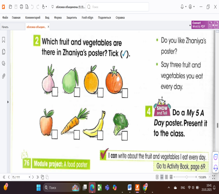Ex:1 P:70 (топтық жұмыс) “The students work in groups, present fruits and vegetables using posters, and say their color and name Fruits-red Vegetables-green |