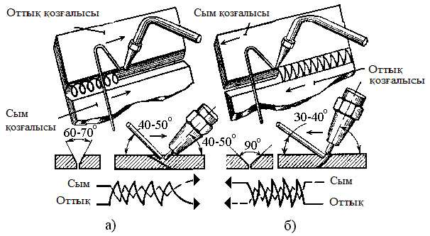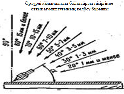 Жалынның пісірілетін бетті қыздыру жылдамдығы газ жандырғы мүштігінің пісірілетін бетке көлбеу немесе енкейтілу бұрышына ( ) сәйкес реттеледі. Ал енді еңкейту бұрышының шамасы бұйымның қалыңдығы мен материалдарына байланысты.