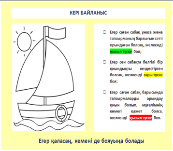 ҚБ. Үшінші желкенді бояу арқылы өздерін бағалап өтеді. -Осы тапсырмаларды орындау арқылы өздеріңе қандай ой түйдіңіздер? -Қай тапсырма қиындық туғызды? -Қандай міндеттер аламыз? Білу, түсіну, талдау, қолдану дағдылары дамиды |