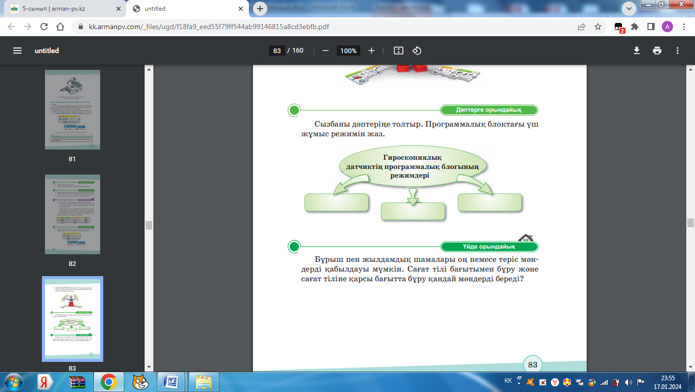 Мұғалімді тыңдайды «Гироскоп» анықтамасын жазады «Гироскопиялық датчик» анықтамасын жазады Суретпен танысады 1-тапсырманы орындайды 2-тапсырманы орындайды 3-тапсырманы орындайды |